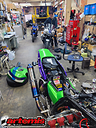 サービス工場の様子をご紹介いたします。春のツーリングに向けてのメンテやご購入いただいたお客様の納車整備、展示する前のコンディションチェックなど多数のバイクが慌ただしく出入りしております。2Fからも次の車両がリフトで降りて来ていますね。メンテナンスもアルテミスにお任せください!